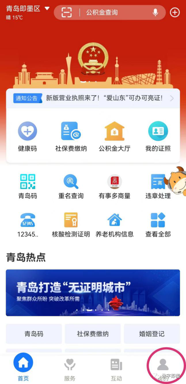第一步:下载“爱山东”APP(文末可下载),打开首页,点击右下角“我的”按钮。