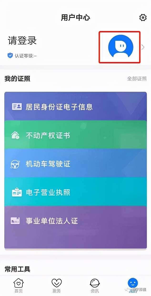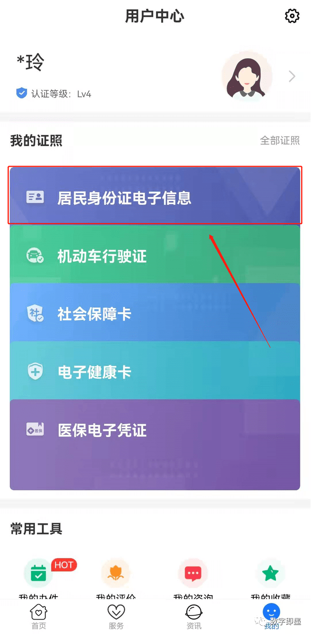 第四步:用户中心,我的证照中,点击“居民身份证电子信息”,进行身份验证。