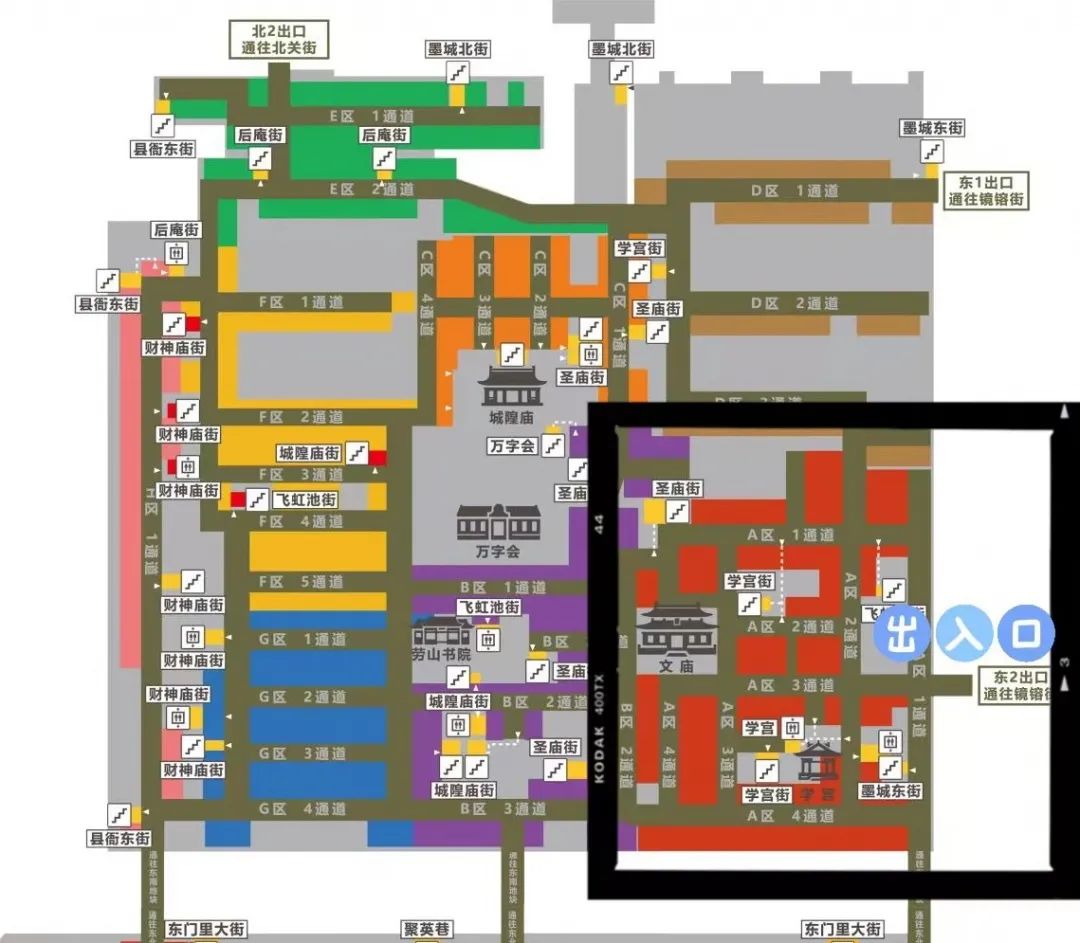 驾车:手机导航-即墨古城东门地下停车场入口-手动选择学宫右侧停车场-建议地下停车区域为方框内部分-选择墨城东街或学宫街楼梯口至地上-到达学宫