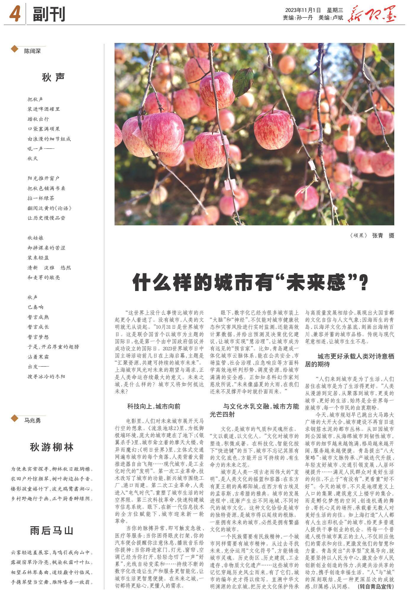 即墨融媒11月1日讯(通讯员 马兆勇)秋游柳林为使来宾常探寻,柳林秋日敞胸襟。农田户外惊颜翠,树叶街边拍手音。楼影孩童嬉竹下,波光鸥鹭翥湖心。乡村野趣行于画,正午厨香醉绿阴。雨后马山云雾轻遮羞展容,鸟鸣引我向山中。露凝宿草泠泠亮,枫染秋霜叶叶红。相望石林琴奏曲,道经巅寺竹临风。手携翠壁当空舞,雁阵嘻吾一放翁。