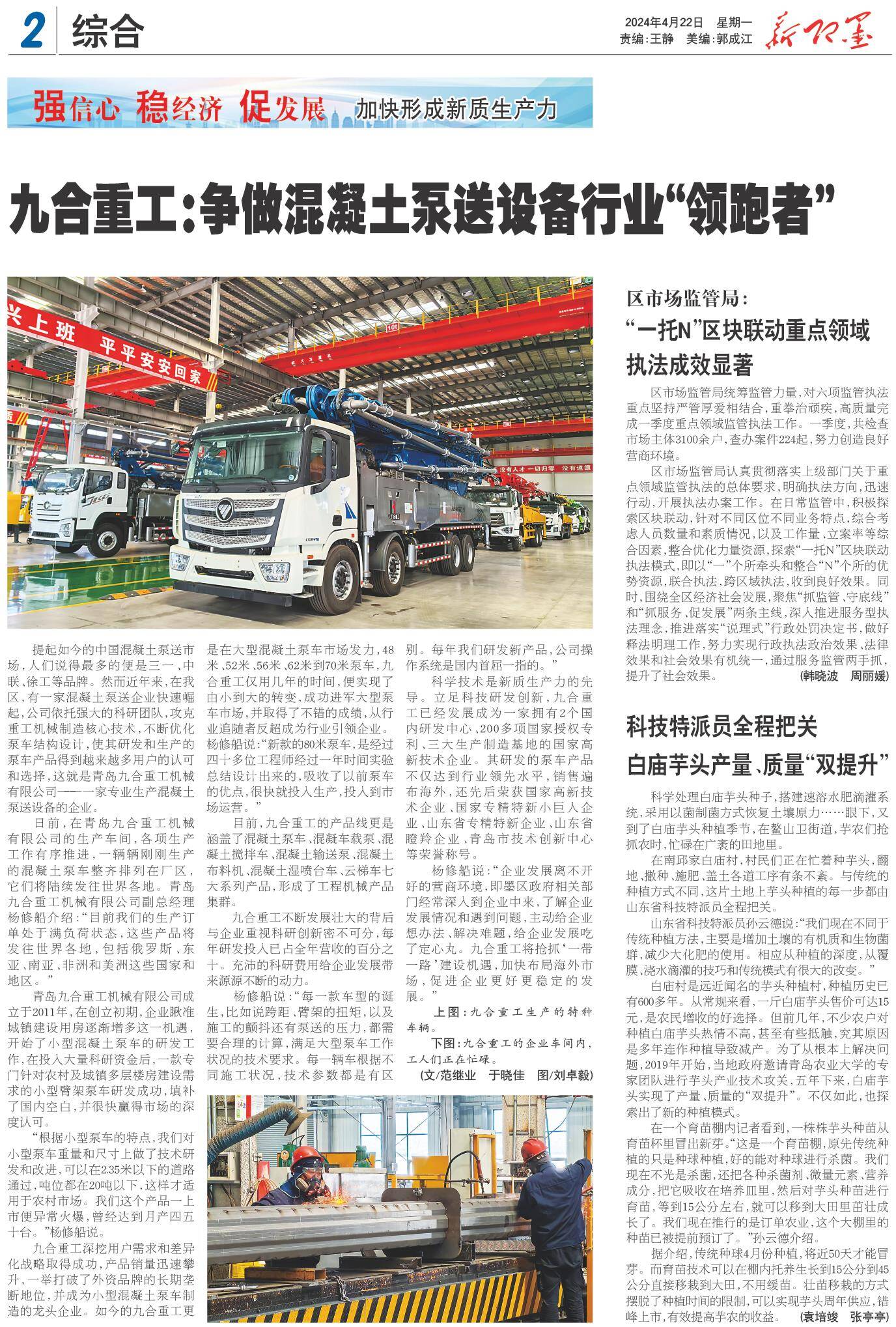 科学技术是新质生产力的先导。立足科技研发创新,九合重工已经发展成为一家拥有2个国内研发中心、200多项国家授权专利、三大生产制造基地的国家高新技术企业。其研发的泵车产品不仅达到行业领先水平,销售遍布海外,还先后荣获国家高新技术企业、国家专精特新小巨人企业、山东省专精特新企业、山东省瞪羚企业、青岛市技术创新中心等荣誉称号。