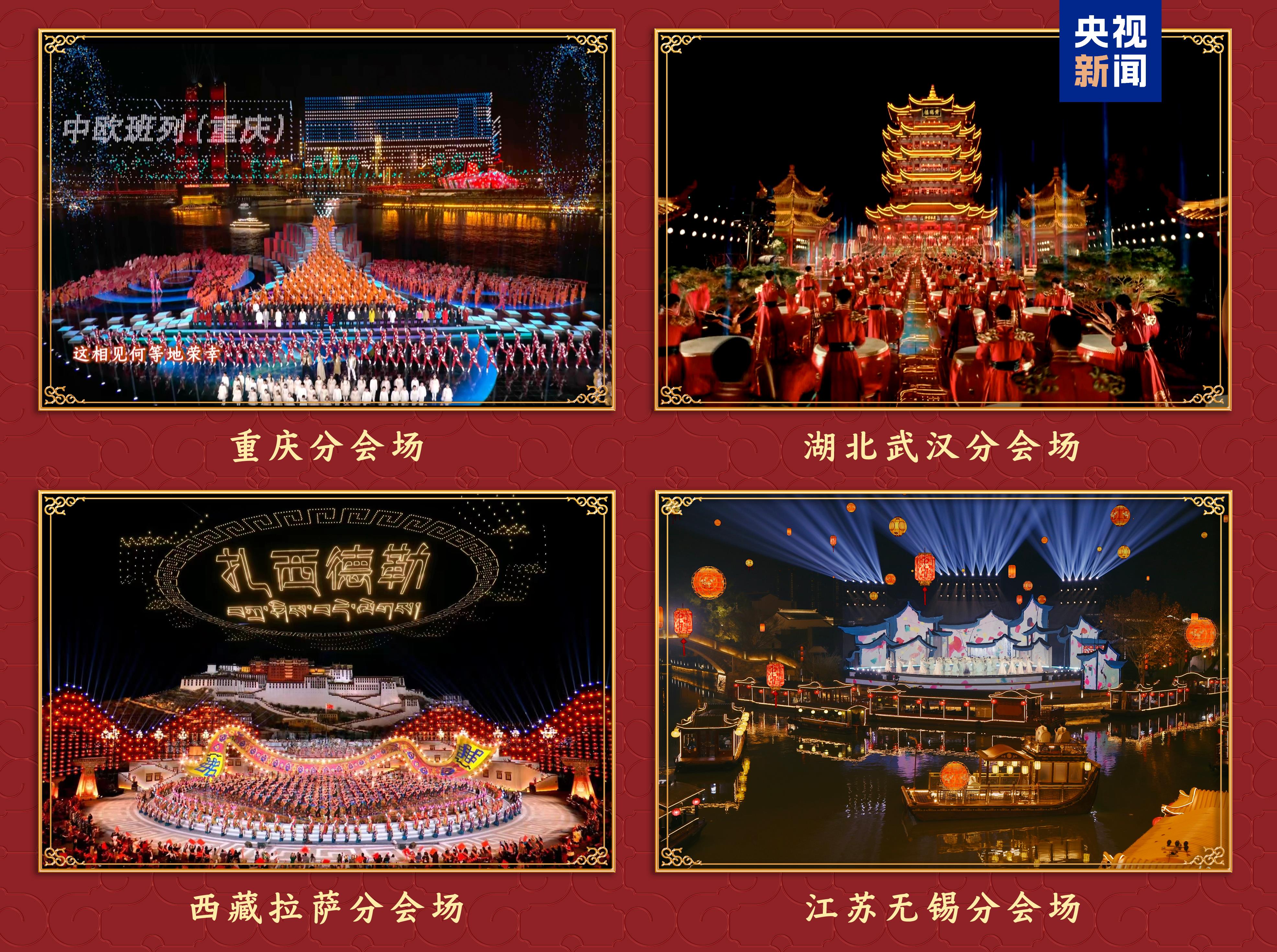 重庆、湖北武汉、西藏拉萨、江苏无锡四地分会场遥相呼应,一幅幅独具城市魅力的画卷,勾勒出祖国山河的壮丽图景。重庆分会场以“庆·新春”为主题,千厮门大桥的“新春新潮夜”情景音乐秀、780辆新能源汽车智控灯阵和3000架无人机编组的光影联动,展现山城8D立体的无限魅力。湖北武汉分会场《星汉耀江城》烟火气浓郁、人情味满满,新派戏曲将京、楚、汉三剧种融汇编创,杂技与传统楚乐创意呈现,凤凰图腾振翅欲飞,“英雄城市”深厚的文化底蕴和大江大湖的豪爽之气一览无遗。西藏拉萨分会场千人鼓潮融汇热巴舞、卓舞等西藏传统舞蹈,才旦卓玛领衔唱出中华民族一家亲的团圆景象;现场还为定日县送去诚挚祝福,表达出人民至上、风雨同舟、重建美丽新家园的坚定信心;那曲萨普雪山、昌都来古冰川等自然风光辽阔壮美,令人神往。江苏无锡分会场在江南水乡上演一场穿越古今的《无锡景·家国情》,曲水穿城而过,评弹曲调婉转流长,文人墨客挥毫泼墨,千年运河之上千帆竞发,在源远流长的文化与磅礴的工业力量中展现“太湖明珠”的丰沛迷人。