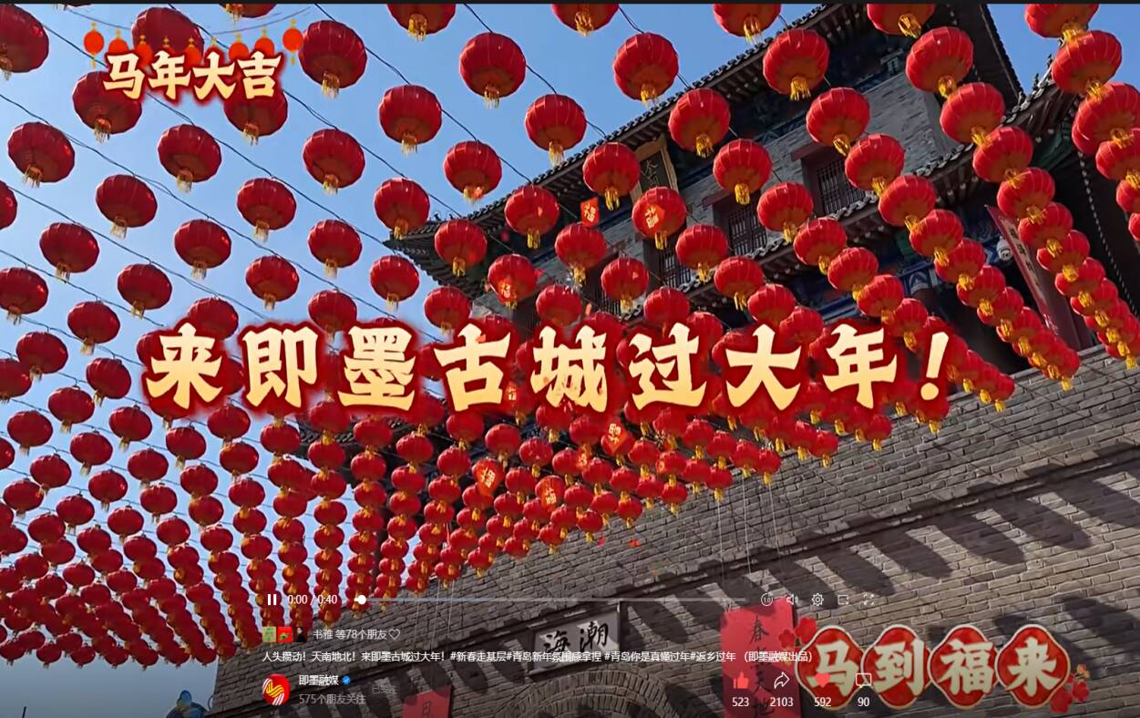 二是全场景直播互动,打造“云上年味”新体验。正月初一至初七和元宵节,“云端逛即墨”直播活动精彩上演。10位记者、主持人化身“文旅推荐官”,在古城街巷、莲花田园、鹤山仙境、滨海海岸等地标性场景接力直播,日播时长90分钟,通过“即墨融媒”抖音号构建起沉浸式节庆体验,累计12万人次在线“云游”。其中,正月初一即墨古城专场直播观看人数超2.2万,成为区域线上新春热点;元宵节当天,推出“欢乐闹元宵”主题直播,吸引8万余人次在线观看。直播中,主持人与网友实时互动,分享非遗民俗、特色美食、文旅攻略,既破解了线下流量分散难题,又为即墨文旅消费注入线上动能,实现了“宣传引流”与“民生服务”的双向赋能。