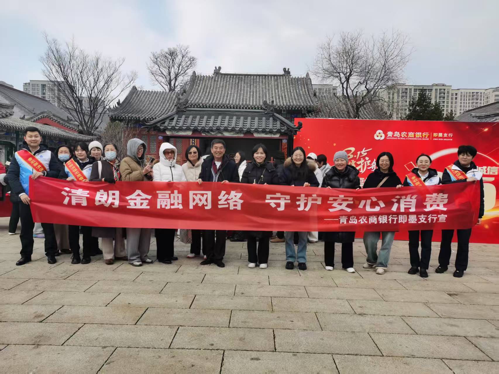 即墨融媒3月12日讯 (通讯员 李晓)在3·15国际消费者权益日来临之际,青岛农商银行即墨支行以“清朗金融网络,守护安心消费”为主题,在即墨古城全面开展金融消费者权益保护宣传活动,以诚信服务筑牢安全防线,用暖心行动守护市民金融安全。