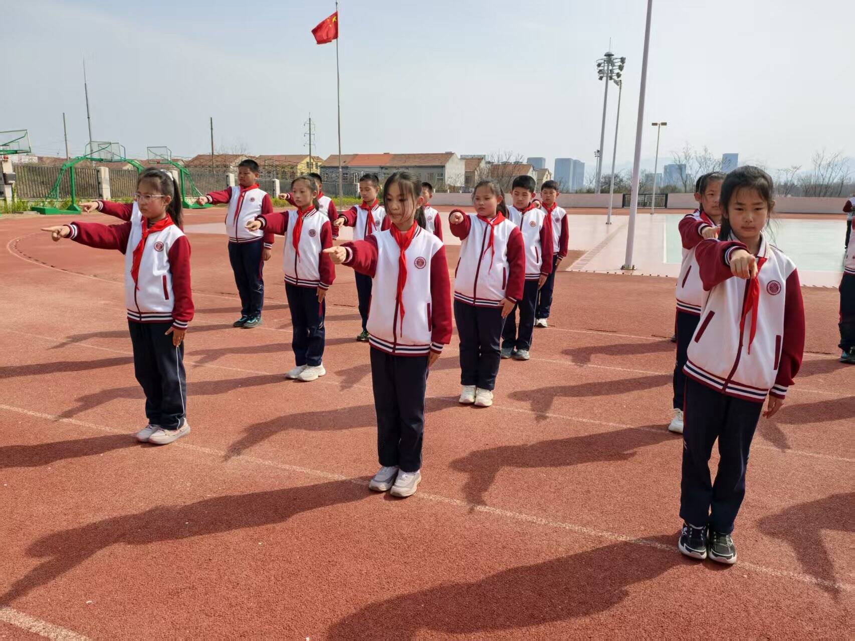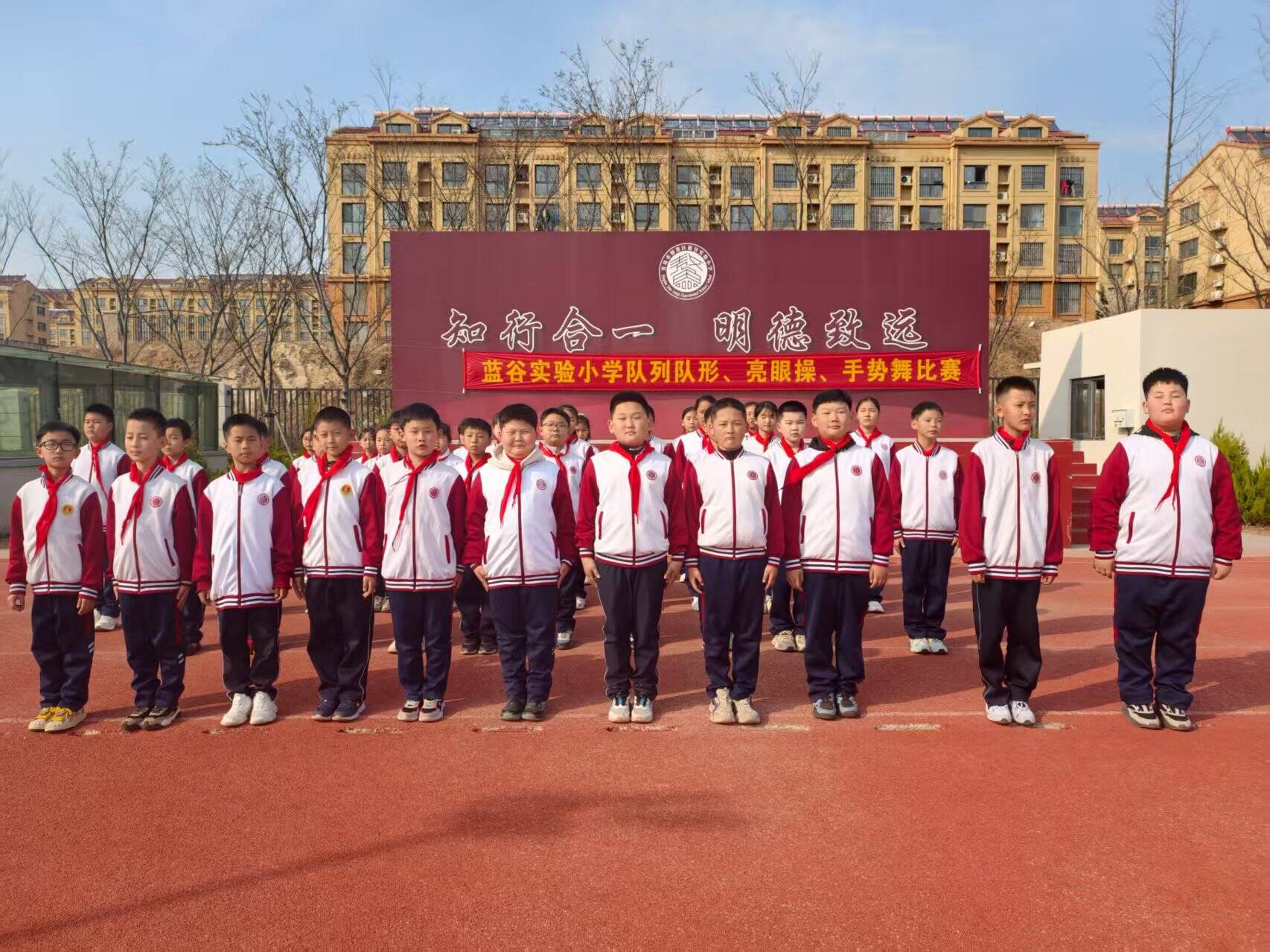 全校学生身着统一校服、佩戴红领巾,以饱满的精神状态投入比赛。队列队形展示环节,各班级在指挥员口令下完成队形变换、队列整肃,步伐整齐、身姿挺拔,展现出扎实的日常训练成效与良好的纪律意识。亮眼操与手势舞比赛中,学生们动作规范统一,或抬手抚额、或伸臂展姿、或握拳高举,在律动中强健体魄,在协作中凝聚团队精神。