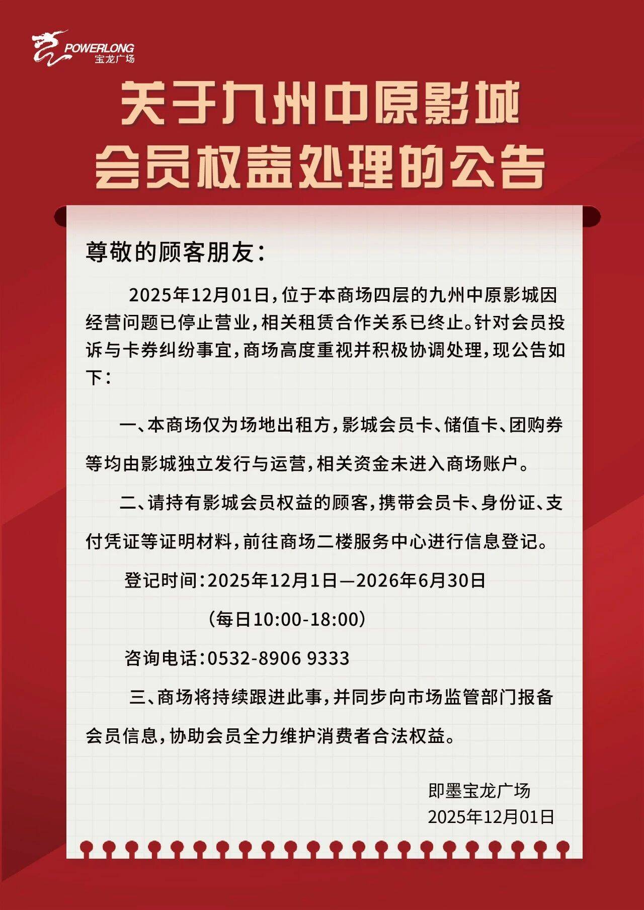 九州中原影城会员权益处理公告