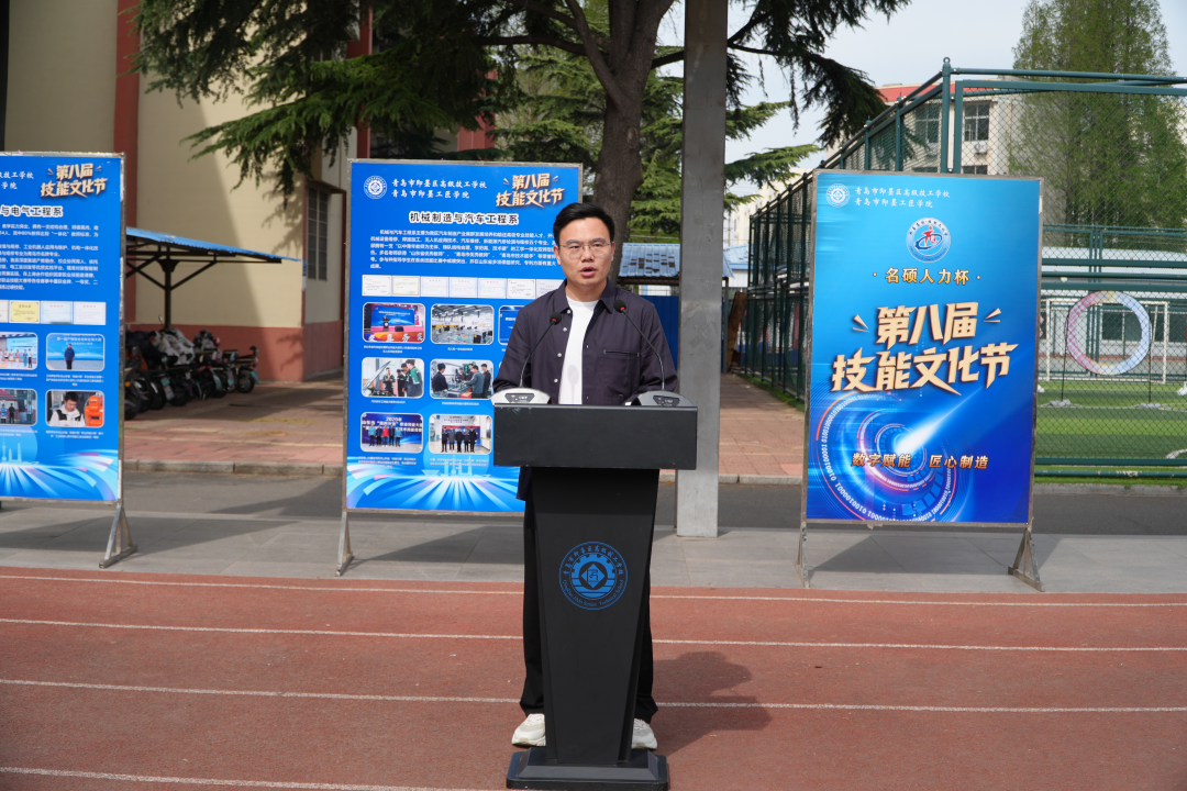 学校副校长杜吉勇致辞。杜校长指出,技能文化节是学校检验教学成果、锤炼师生技艺、传承工匠精神的重要平台。本届技能文化节以“数字赋能,匠心智造”为主题,聚焦数字化、智能化技能培养,创新赛项设置,深化校企合作,旨在全面提升师生专业技能与综合素养,培育更多高素质技术技能人才。