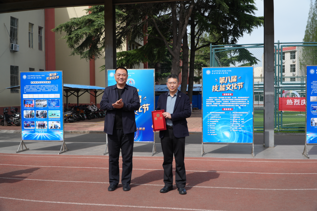 校党总支书记、校长李惠民向青岛名硕人力资源管理有限公司颁发“第八届校园技能文化节”冠名证书。