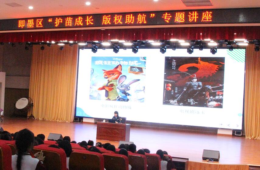 在讲座过程中,《熊出没》《疯狂动物城》等经典动画角色接连登场,学生们兴趣盎然、踊跃互动。执法人员顺势延伸,让小读者们明白动画片、音乐歌曲、美术绘画、绘本故事等日常喜爱的文化产品,都是受版权保护的“创意宝藏”。